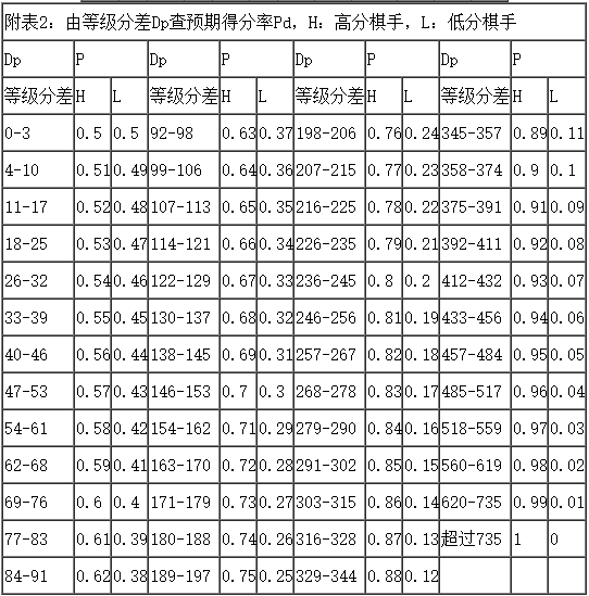 制度名称:中国围棋协会五子棋项目等级分制度实施办法 (暂行)发布时间:2024-01-29 来源:棋牌运动管理中心 为了更好地体现我国五子棋棋手的竞技水平和整体情况,完善我国五子棋运动的制度建设,推动我国五子棋运动的可持续发展,中国围棋协会制定了五子棋项目等级分制度实施办法(暂行)。 第一条 等级分 (一)等级分是棋手比赛的数学化指标。它用得分率转换成等级分。它的作用是以最佳的统计数字表示科学的测量数据。中国围棋协会实施五子棋项目等级分制度,面向全国所有的五子棋棋手,符合该项目在全国的发展状况和未来发展趋势。 (二)等级分由中国围棋协会五子棋分会根据棋手在统计期内参加各类比赛的成绩来进行计算,并在确认后公布、存档。 第二条 等级分的公布 (一)经过计算确定后的等级分,由中国围棋协会五子棋分会于每年1月1日、7月1日在官方网站中国棋院在线或相关刊物上公布,以体现其权威性。 (二)凡跨越统计公布期限的比赛,其统计期限以比赛结束日期为准。 (三)无等级分棋手必须在一次比赛中至少与3名有等级分棋手相遇才能计算等级分,未下满7局者不予公布。(下满7局的条件不需要在一次比赛中遇到,但必须在24个月内完成,以便取得首次等级分)。 (四)有正式等级分的棋手连续12个月(即一个计分周期)内参加的等级分赛中所完成的可计等级分的对局(计分局)数少于7局,将被列为“不活跃”棋手,其姓名转列入“不活跃棋手”名册;被列为“不活跃棋手”的棋手在被除名前连续12个月(即一个计分周期)内参加并完成的计分局数多于等于7局,将恢复“活跃棋手”身份,并列入下次公布的等级分名册。 (五)“不活跃棋手”名册与等级分名册同时公布。 (六)“不活跃棋手”连续在榜24个月,将被除名。将其作为无等级分棋手对待。 (七)男女选手混合公布。 第三条 等级分的管理 五子棋等级分的管理由中国围棋协会五子棋分会指派专人(等级分管理员)进行管理,其职能是统计核实棋手等级分,建立棋手等级分档案,每周期公布棋手等级分。 第四条 可计算等级分的比赛 (一)由国家体育总局、国家体育总局棋牌运动管理中心和中国围棋协会五子棋分会主办或承办的国际性赛事。 (二)由国家体育总局、国家体育总局棋牌运动管理中心和中国围棋协会五子棋分会主办或承办的全国性赛事。 第五条 等级分赛的条件和要求 (一)至少应有两名由中国围棋协会五子棋分会认可的具备全国性比赛执裁经验的裁判主持整个竞赛裁判工作。 (二)采用国家体育总局最新审定的中国五子棋竞赛规则。 (三)积分编排制的比赛中在20人(含20人)以下,不得少于5轮次;20人以上,不得少于7轮次。 (四)在循环制的比赛中应当至少有1/3的参赛棋手有等级分。 (五)参赛人数少于10人的比赛至少应有4人有等级分。 (六)采用循环制的全国比赛、我国举办或承办的国际比赛,如果开赛前至少有3名男棋手(只有女子参赛的比赛中有2名女棋手)拥有正式等级分,应予计算等级分。 (七)凡有等级分棋手之间的对弈,对局成绩一律计算等级分。 (八)比赛用时的规定: 1.在计时计着制比赛的用时规则中,每局比赛每方第一时限不得少于60分钟。 2.“费舍尔制”用时的基本时间不得少于45分钟,每手棋加秒不得少于30秒。 3.一次等级分赛的比赛期限不得超过30天。 (九)承认女子在男女混合比赛中达到的等级分标准。 (十)不论一次等级分赛分成几个阶段(预赛、决赛和加赛)进行,其成绩合在一起计算。 (十一)不论是有等级分棋手还是无等级分棋手,没有实际比赛的对局,无论是弃权还是任何其他原因,一概不计算等级分。 (十二)如果无等级分棋手在比赛中的得分为零,他的成绩及与他对局的对手成绩在计算等级分时都不予考虑。 第六条 等级分计算方法 (一)依据竞赛报告计算本次比赛的平均等级分Rc。 1.在积分编排制、团体赛或对抗赛中,以棋手所遇对手的平均等级分为比赛的平均等级分Rc。 2.在循环赛中有以下几种情况: (1)有等级分棋手的平均等级分Rar。 (2)计算有等级分棋手时:比赛的平均等级分Rc = 所遇对手的平均等级分。 (3)计算无等级分棋手时:比赛的平均等级分Rc = 无等级分棋手比赛的平均等级分Ra。 Ra = Rar-Dpa×n/(n+1) 公式中,Dpa为对手的平均等级分差,n为对手人数。 (二)依据竞赛报告计算本次比赛中有等级分棋手的等级分的变动值。 1.以该棋手和每个有等级分棋手的对局,来确定他和对手之间的等级分差D。 2.根据等级分差值D计算出来的预期得分率Pd。由附表(2)中查得。 3.等级分的变动值公式为: ΔR = K×(W-We) 公式中,ΔR为等级分的变动值,正值为升,负值为降。 W为实得局分。 We为预期局分。 K为换算系数。对于无等级分棋手,在前30局实际计算等级分的对局中K值取25,以后取15,等级分一经达到2000分以上,以后即使再降也永远取10。 4.积分编排制、团体赛或对抗赛中按下列公式计算预期局分We: We=N×Pd 式中N为对手人数,Pd是根据棋手本人等级分R与对手的平均等级分Rc之间差值D计算出来的预期得分率Pd。由附表(2)中查得。 5.单循环制比赛算法同上。 (三)将棋手在某一次比赛或整个统计期限内各次比赛的升降值累加(减)之后,即得出该棋手在该期限的总升降值,再与棋手的原等级分相加(减),即得出棋手的新等级分Rn。 公式如下:Rn =Ro+ΣΔR Rn为新等级分,Ro为原等级分,ΣΔR为总变动值。每