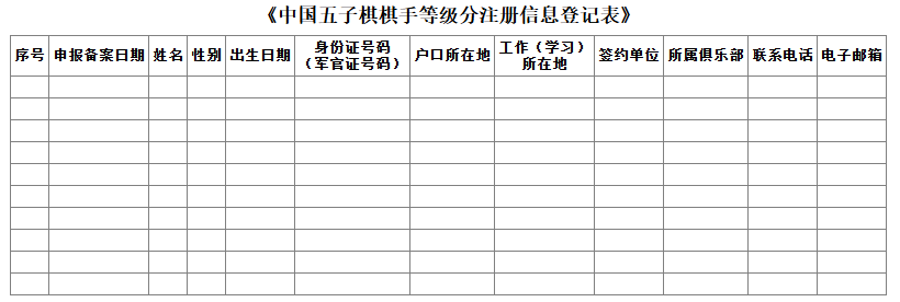 关于做好全国五子棋棋手等级分注册管理工作有关事宜的通知各省、自治区、直辖市、计划单列市棋牌运动管理中心、棋院、棋类协会及相关机构: 为了进一步推动我国五子棋项目的发展,积极引导更多的省区市和有关单位开展五子棋运动,推动我国五子棋竞赛管理工作的科学化、制度化、规范化,根据《中国围棋协会五子棋项目等级分制度实施办法》(暂行)的有关要求,中国围棋协会五子棋分会从2011年1月1日起对全国五子棋比赛的参赛棋手进行等级分注册管理,现将有关事宜通知如下: 一、注册资格 凡爱好五子棋、身体健康的中国公民均可进行注册。 只有完成等级分注册并通过审批的棋手才有资格在参加由国家体育总局棋牌运动管理中心和中国围棋协会五子棋分会主办的比赛后进行等级分计算。 二、注册办法 (一)注册人员须在中国棋院在线网站上下载《中国五子棋棋手等级分注册信息登记表》。 (二)下载后须如实填写有关内容,如发现填报内容与事实不符,则在此前该选手参与的所有可计算等级分的比赛所获得的成绩无效。 三、注册时间 注册时间每年两次,分别为每年1月1日到1月31日和7月1日到7月31日。参与注册的选手应在注册时间内将填好的表格发至指定邮箱:xialu418@sina.com(截止时间以发出时间为准)。2011年首次注册的截止时间为2011年2月28日。 四、中国围棋协会五子棋分会收到棋手提交的注册信息后进行审核登记备案工作。在每次注册时间终止后,中国围棋协会五子棋分会将统一在中国棋院在线上进行公布。 五、棋手注册信息一经公布,即成为等级分注册选手,并开始计算其参加的可以计算等级分比赛的责任局数和计分周期。 六、棋手等级分注册工作联系方式:国家体育总局棋牌运动管理中心综合发展部 夏露 。 咨询电话:(010)87559187 七、未尽事宜,另行通知。 附件:《中国五子棋棋手等级分注册信息登记表》序号 申报备案日期 姓名 性别 出生日期 身份证号码(军官证号码) 户口所在地 工作(学习)所在地 签约单位 所属俱乐部 联系电话 电子邮箱